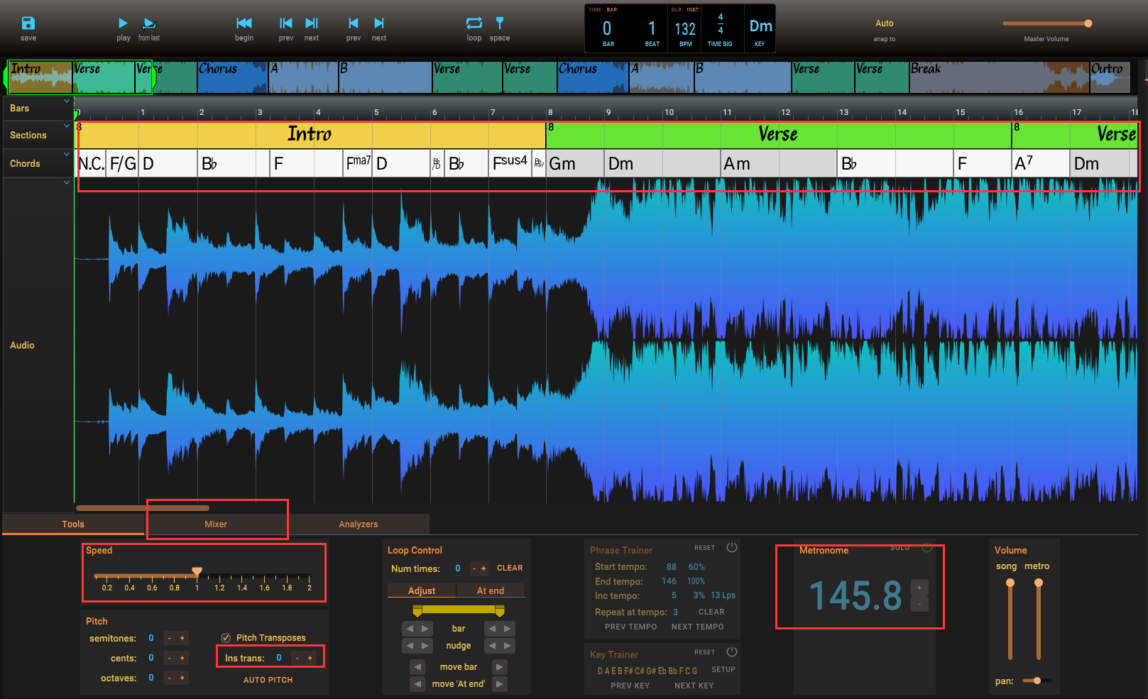 功能:自动识别和弦(准确度极高)、自动测速、改变音频速度、升降调、乐器人声分离等等